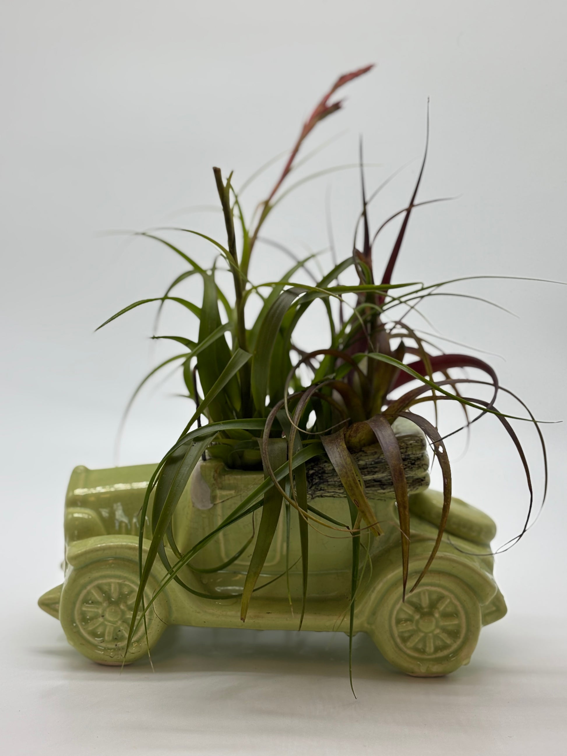 Ready to roll into your heart—and your home. This whimsical display features a vibrant mix of air plants (Tillandsia) cruising in a minty green ceramic vintage car planter, complete with a blooming sky plant for a pop of floral flair.